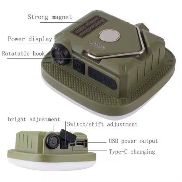 بدنه این لامپ از پلاستیک نشکن ABS ساخته شده و دارای قلاب آویز و آهنربا برای نصب راحت به هر سطح فلزی یا آویزان کردن در مکانهای مختلف است. شارژ لامپ از طریق پورت USB-C انجام میشود و باتری داخلی آن از نوع لیتیوم یون است که هم ایمن و هم بادوام است. قطر 100 میلیمتری آن، نور کافی را در فضای اطراف پخش میکند و طراحی سبک و جمعوجور آن، جابهجایی و استفاده در سفر، خودرو یا خانه را بسیار راحت کرده است. این مدل همراه با کابل شارژ در بستهبندی ارائه میشود و برای هر موقعیتی آماده به کار است.
